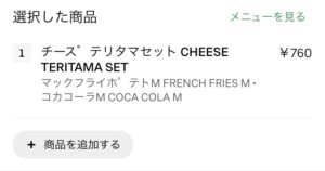 上の画像は、マック(マクドナルド)で「チーズテリタマセット」を注文する時の画面です。